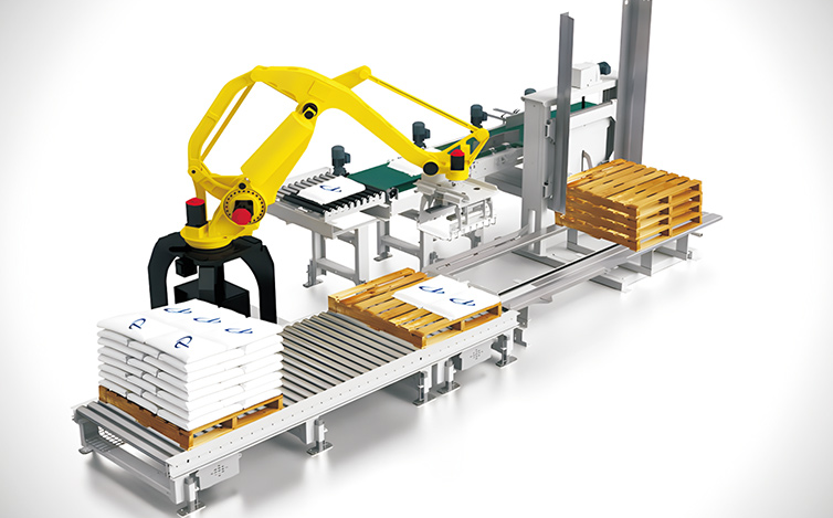 实机器人是这些多功能系统的核心。它能把袋子、盒子或木板箱堆成码垛,然后放置在适合的输送设备上运输到你需要的任何位置,装好的托物盘可以用堆高机进行堆叠,或安全轻便地通过滚筒输送设备运输到后面储存地或者进行流转。